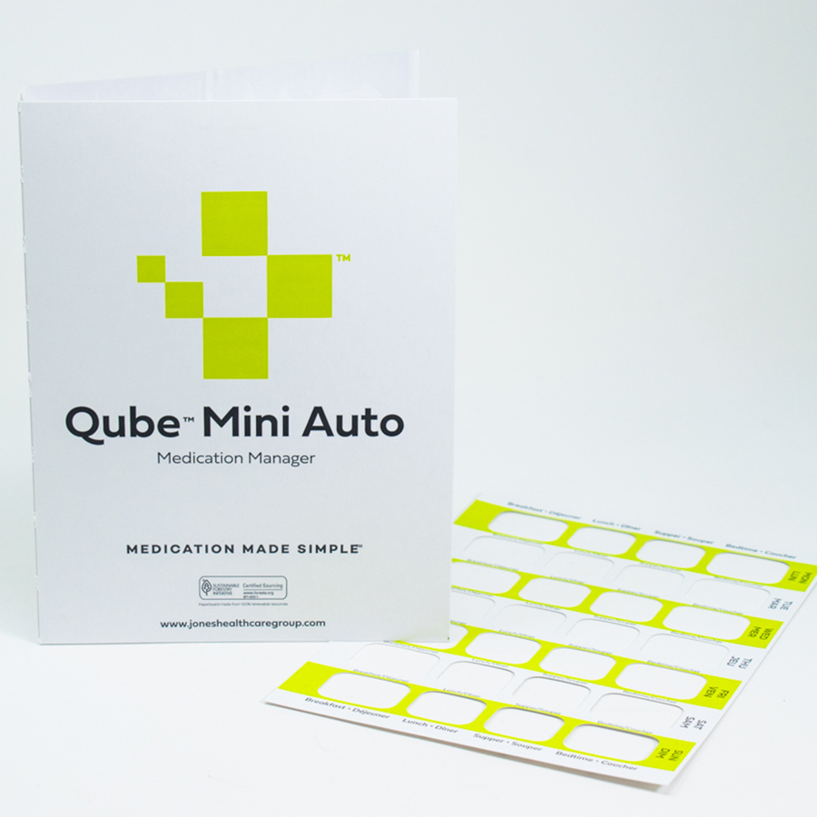 Carte générique pour le Qube™ Mini Auto – emballage hebdomadaire de 28 cavités (anciennement appelé Auto-Fill), qui comprend 4 doses quotidiennes pendant 7 jours. La carte peut être marquée et personnalisée sur demande. Conçue pour les technologies d’automatisation de pointe. Plaquettes alvéolées carrées inviolables scellées à froid et faciles à remplir (cavités plus grandes pour le matin et le soir) et étiquettes vendues séparément.